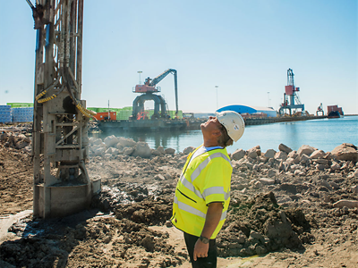 Farehamnen 新港口项目一直持续到 2024 年。该港口已经是瑞典规模较大的锯材出口港,新港口的目标是继续扩建。在这里,Svenska Dmixab 在电驱移动空压机 E-Air 250 VSD 的帮助下,通过向下吹入熔渣产物,将其在地下与粘土和水混合,形成稳定的支柱(地下 25 m 深处)。这种技术称为干法施工,在北欧国家被大量采用,这是因为冰河时代留下的粘土特别适合这种方法。多凝水泥支柱用于应对码头区域的载荷。由于 E-Air 不会排放二氧化碳或噪音,再加上使用了熔渣产物,该项目总体上拥有更好的可持续性——这些正是 Nibben 所看重的: