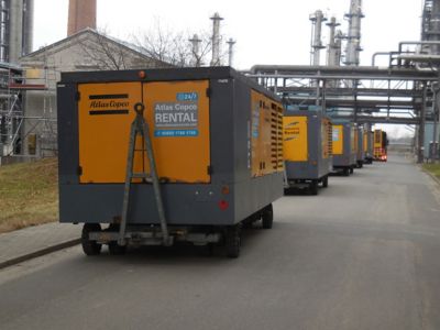 Hemmingstedt:在星期五上午 11 点 30 分,阿特拉斯·科普柯租赁公司接到 Raffinerie Heide GmbH 的来电,要求尽快提供 5 台 PTS 1600 压缩机。阿特拉斯·科普柯在 3.5 小时内就将 5 台 PTS 1600 压缩机装上 3 辆卡车,然后驱车 115 公里,将它们运送到 Hemmingstedt,并确保它们快速地投入运行。